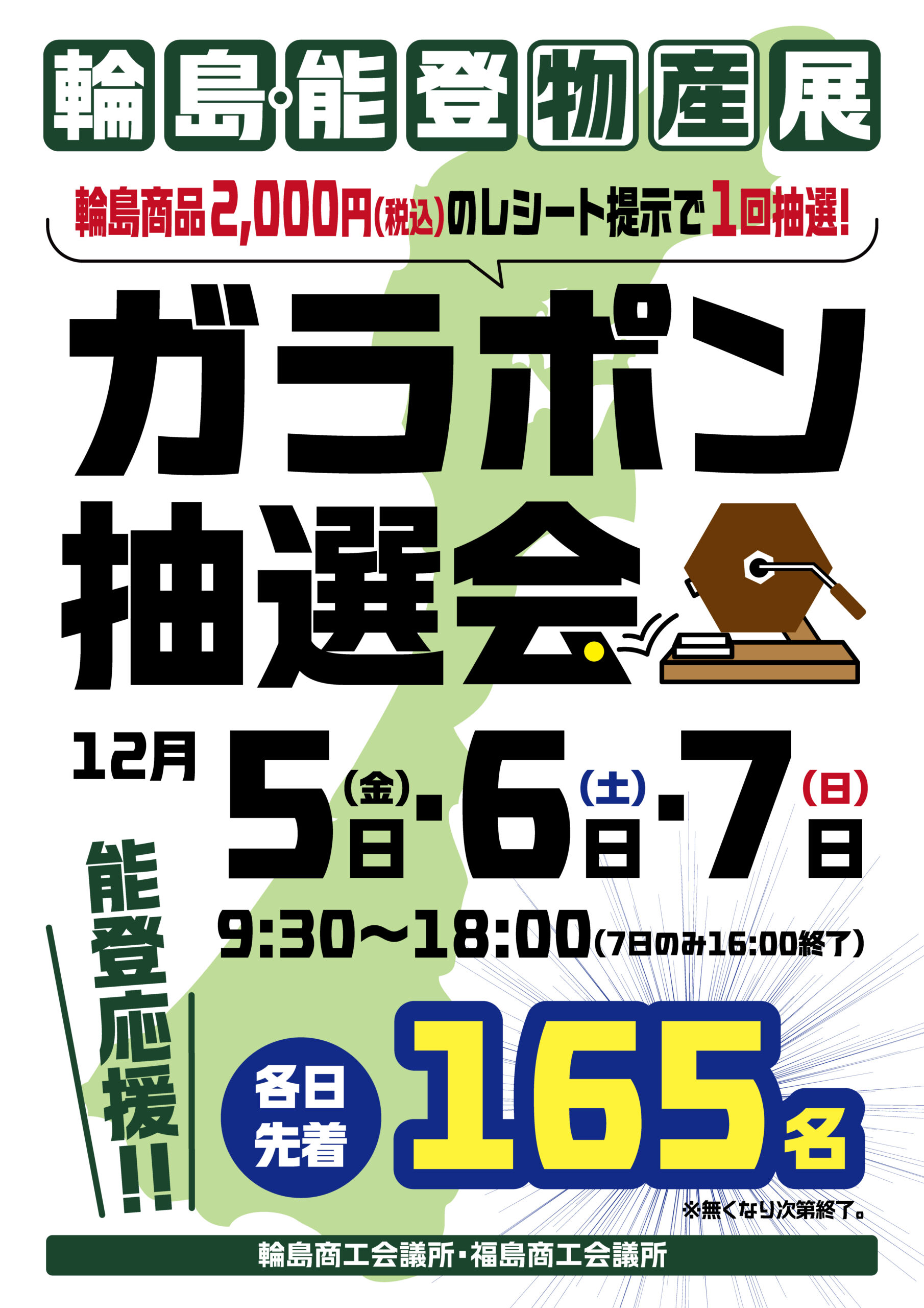抽 選:コラッセふくしま1F アトリウム ※各日先着165名、輪島能登物産展の商品を 税込2,000円以上のレシートを提示で1回抽選