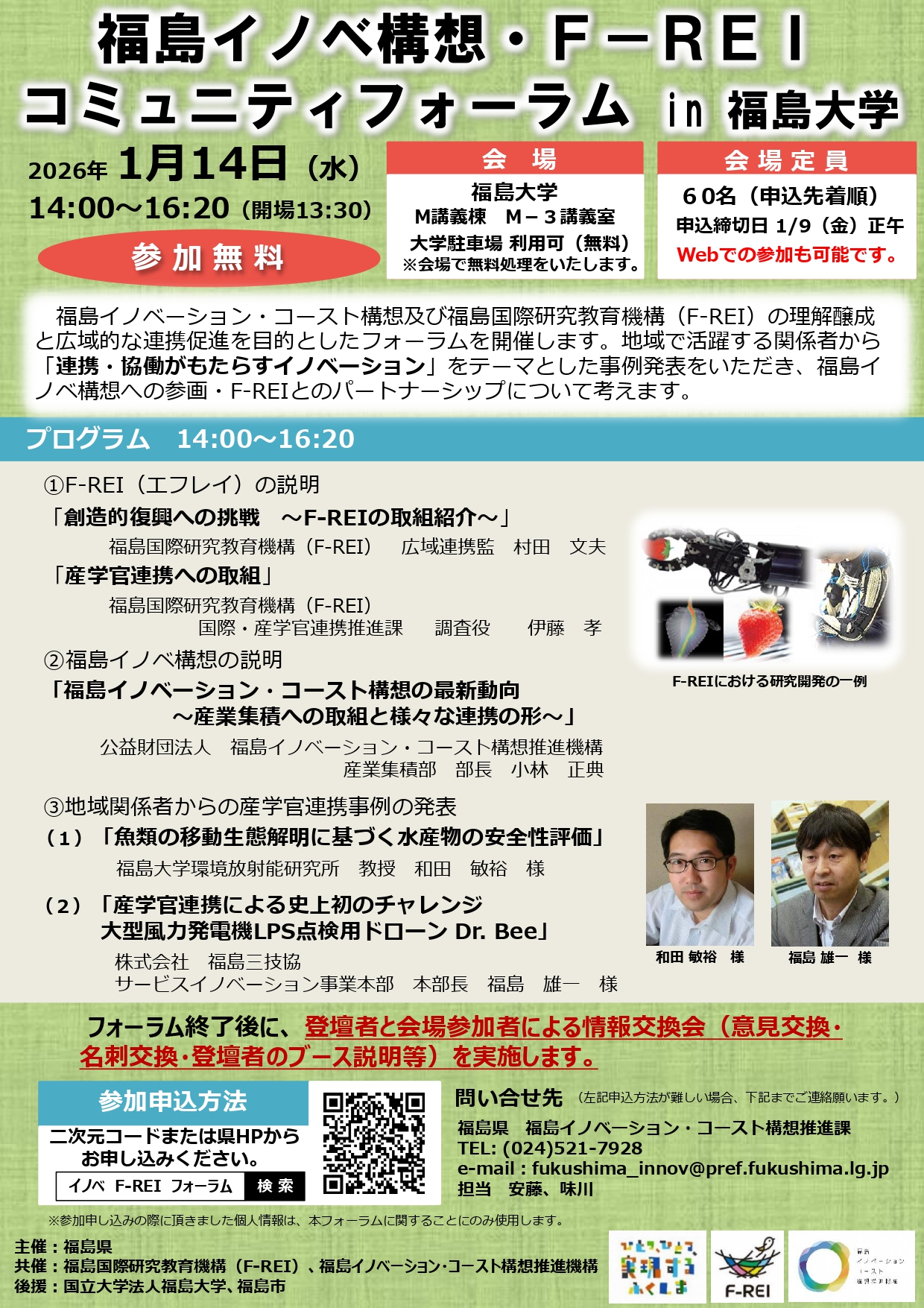 福島県では、福島イノベ構想及び福島国際研究教育機構(F-REI)の理解醸成と広域的な連携促進を目的としたフォーラムを1月14日(水)に開催します。