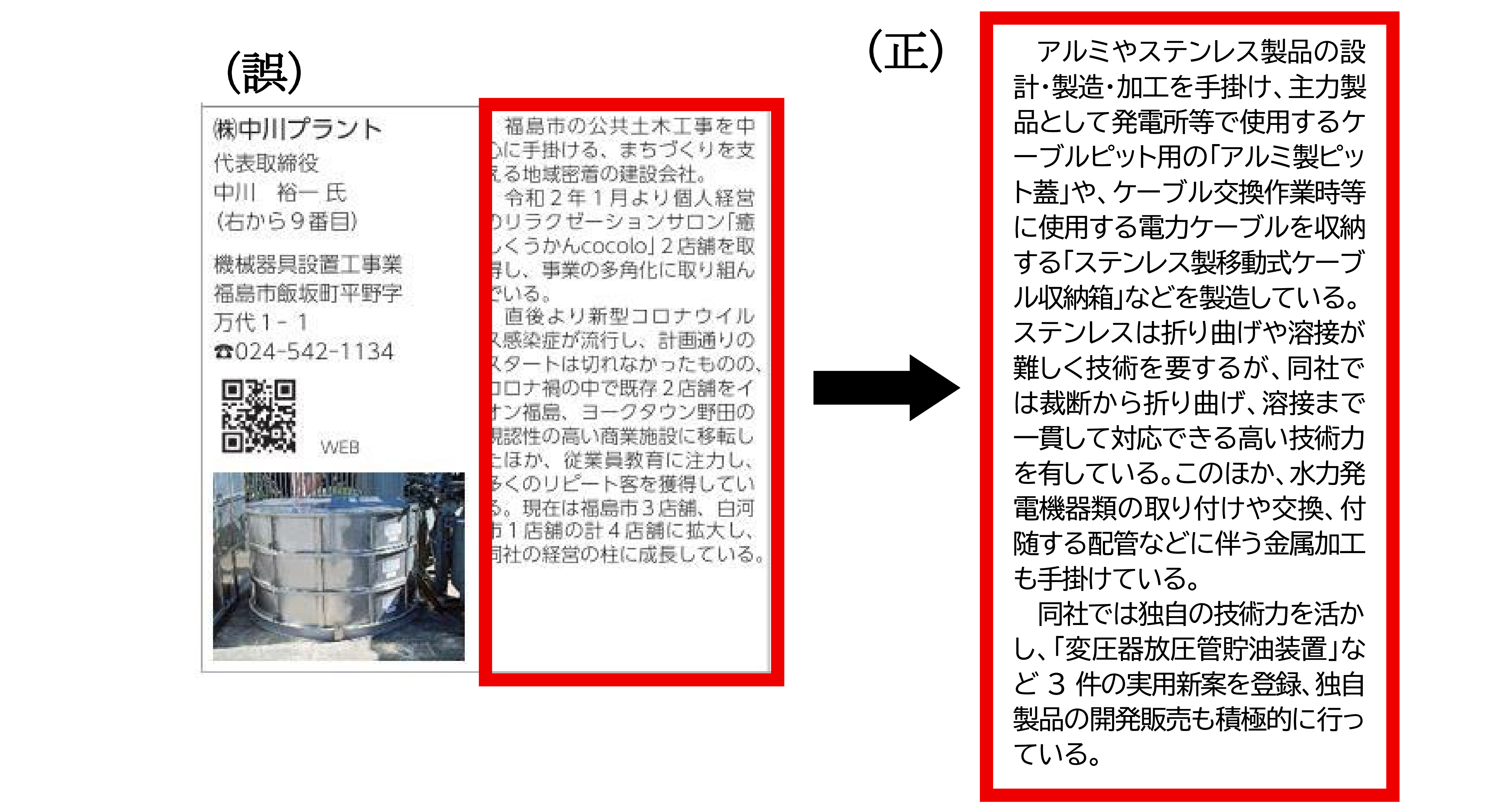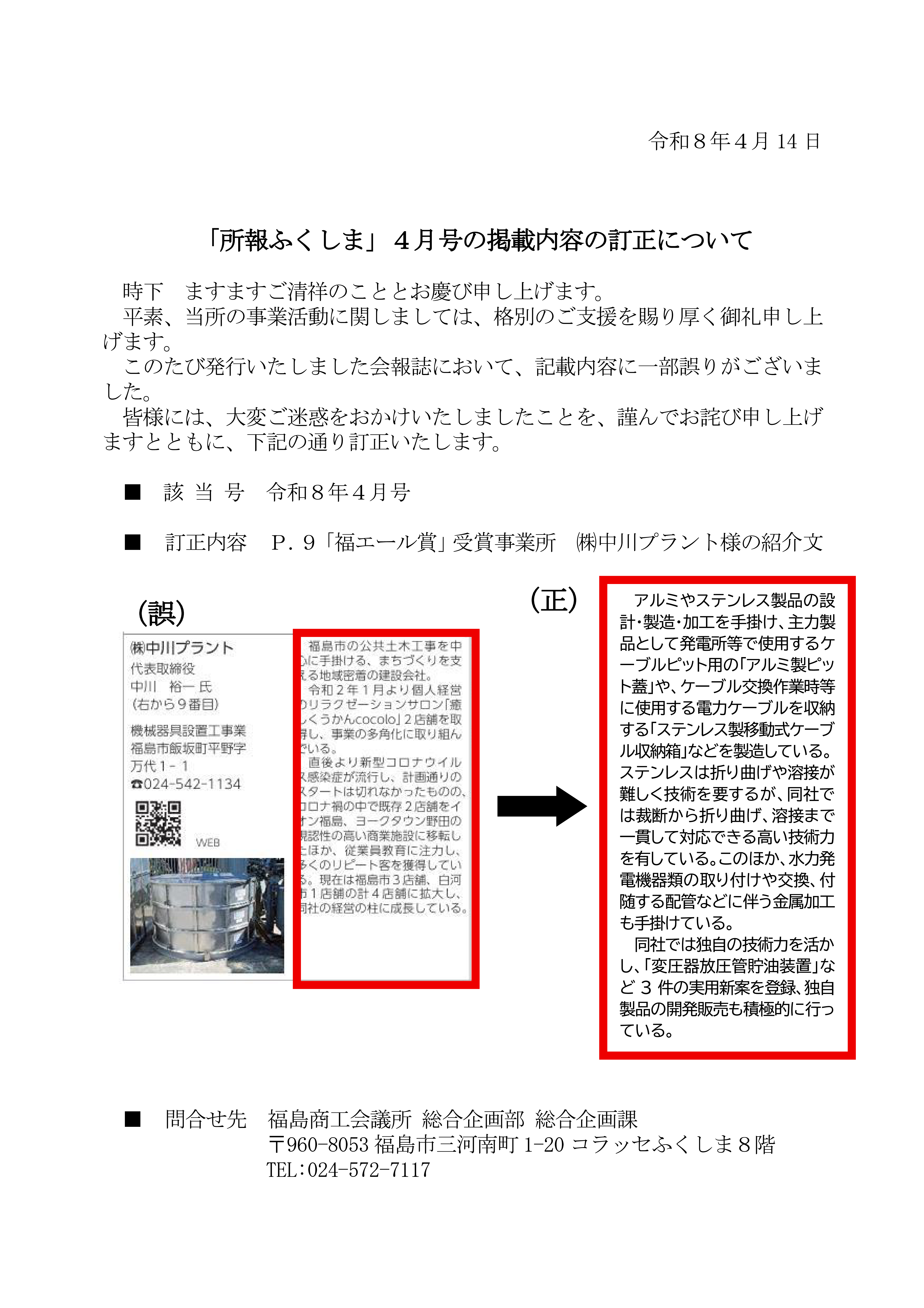 「所報ふくしま」4月号の掲載内容の訂正について このたび発行いたしました会報誌4月号において、記載内容に一部誤りがございました。 皆様には、大変ご迷惑をおかけいたしましたこと、謹んでお詫び申し上げますとともに、下記の通り訂正いたします。 ■ 該当号 令和8年4月号 ■ 訂正内容 P.9「福エール賞」受賞事業所 ㈱中川プラント様の紹介文 ■ 問合せ先 総合企画課 TEL:024-572-7117 更新日:2026年4月16日